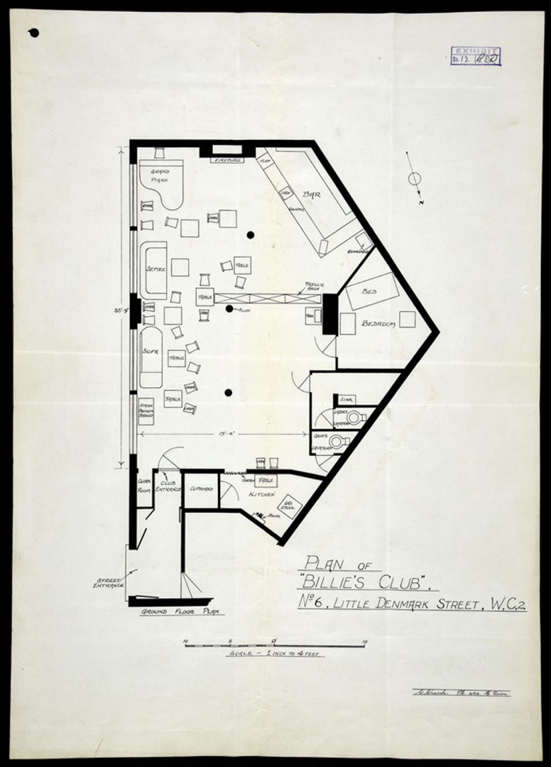 A plan of ‘Billie’s Club’, London, used as an exhibit in a prosecution for conspiracy to corrupt morals (catalogue reference: DPP 2/355)