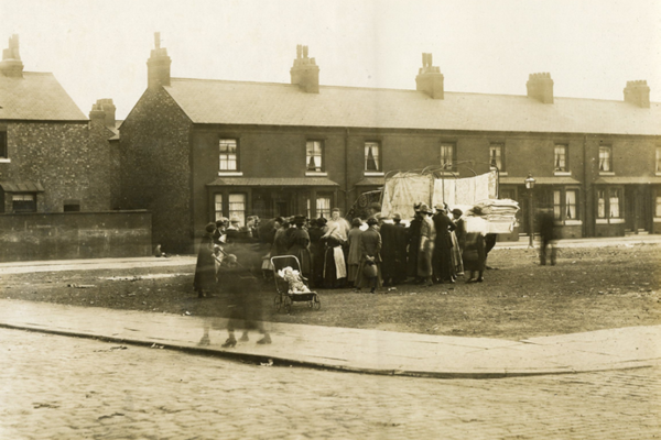 These ex-soldiers had set up unofficial markets on the street corners of working class districts of Salford. Before World War One, most of them had been the owners or holders of small shops. They had closed these shops or sold them to sign up for military service and then, for various reasons, had been unable to resume their business. Two photographs of the unofficial markets set up by these ex-soldiers are in the Salford City Archives. Both pictures show a market stall set up on open ground by a row of terraced houses. Gathered round the stalls are about 30 to 40 people, mainly women but with some men. They look like they are listening intently to the sales pitch of the stallholder. Piled high on the stalls is textile material, possibly to be used as sheets, curtains or made into clothes.