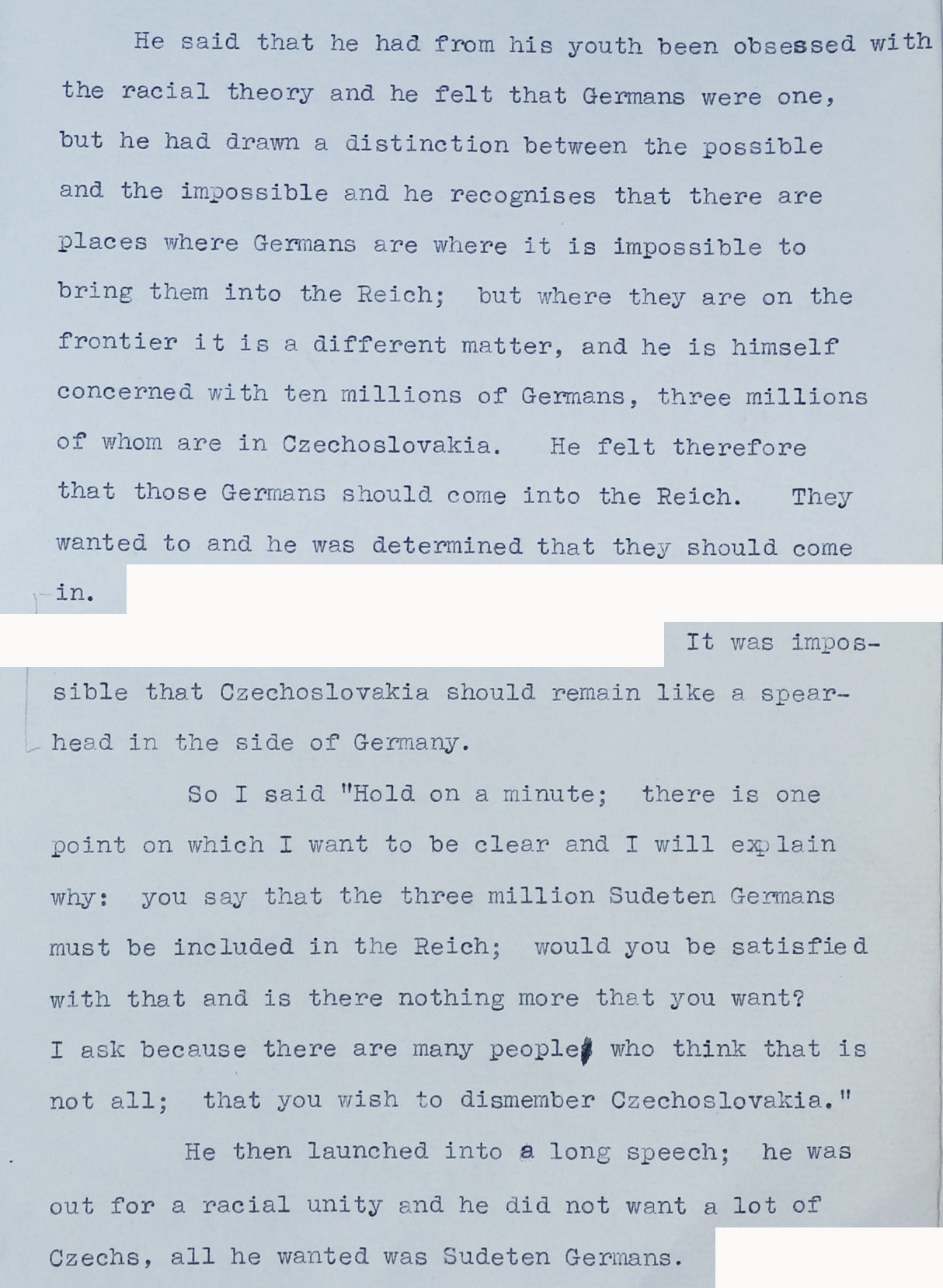 He said that he had from his youth been obsessed with the racial theory and he felt that the Germans were one, but he had drawn a distinction between the possible and the impossible and he recognised that there are places where Germans are where it is impossible to bring them into the Reich; but where they are on the frontier, it is a different matter, and he is himself concerned with ten millions of Germans, three millions of whom are in Czechoslovakia. He felt therefore that those Germans should come into the Reich. They wanted to and he was determined that they should come in.