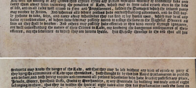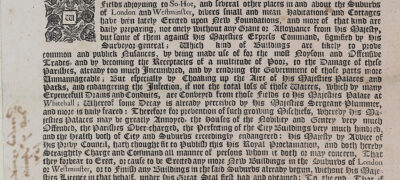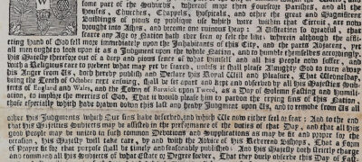 Other sources in this collection are ‘official’ printed proclamations or reports of events, including from the London Gazette, a newspaper established by Joseph Williamson in 1665. The royal proclamations are concerned with regulating the rebuilding of houses after the fire, restoring goods to their rightful owners, encouraging charitable donations to the afflicted, and announcing a solemn day of fasting and penitence to seek God’s mercy. These proclamations provide us with an understanding of how the government tried to restore law and order in the aftermath of the fire, and how they sought to help individuals in need.