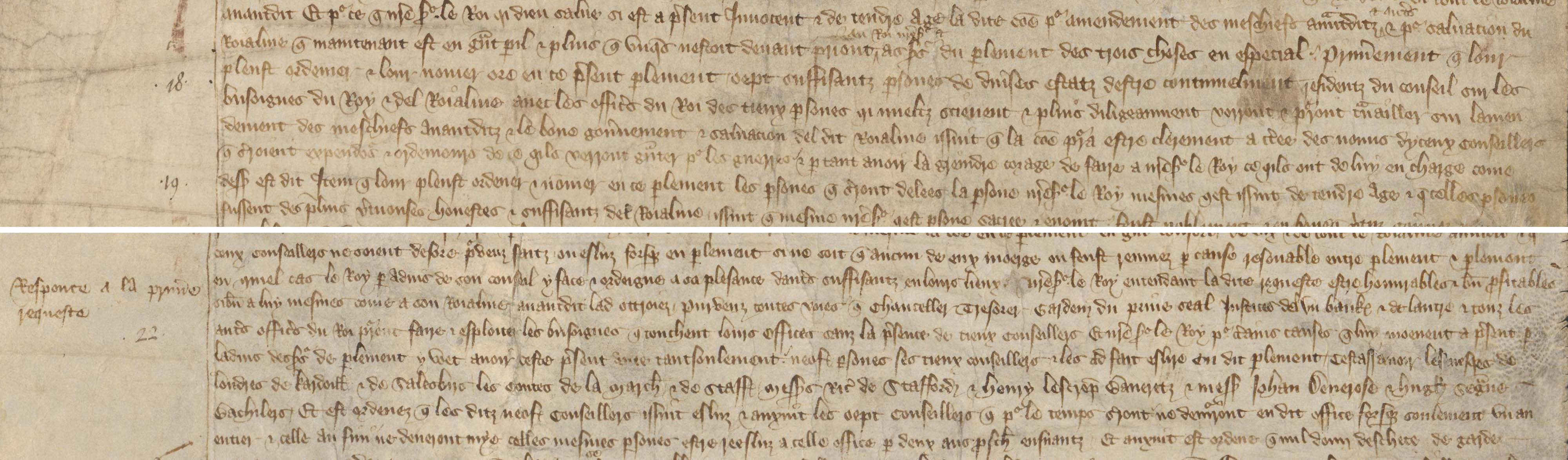 [18.] First, that it please him to ordain and name for them in this present parliament eight worthy persons of divers estates, to be continually at hand to advise on matters concerning the king and kingdom with the king’s officers, from amongst such persons who know best, and who wish and are able to work most diligently towards amending the aforesaid troubles, and the good governance and security of the said kingdom; so that the commons might be fully informed of the names of those councillors, who will spend and manage the money which is granted them for the wars, and therefore have greater heart to perform for our lord the king that with which he has charged them, as is said above…