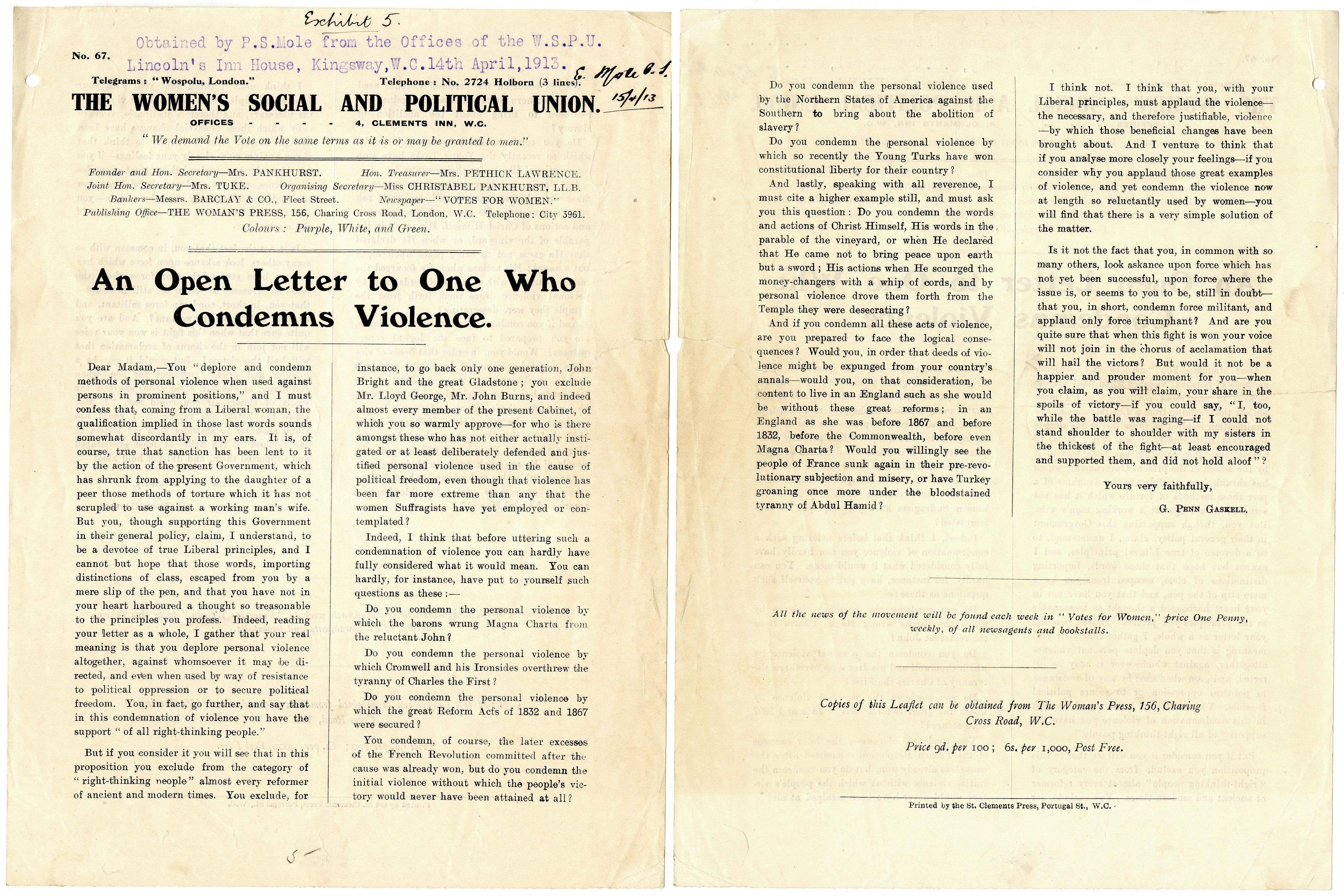 Leaflet produced by the Women’s Social and Political Union (WSPU) called ‘An open letter to one who condemns violence’, May 1913 (Catalogue ref: CRIM 1/140/1)