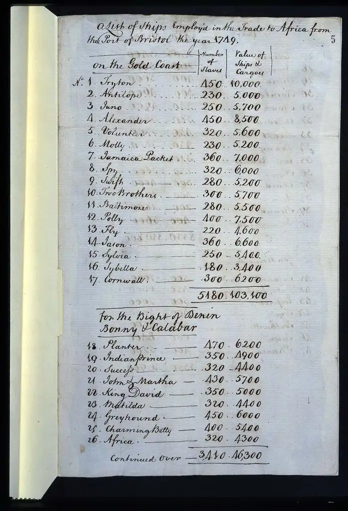 This document is a list of ships employed in the trade to Africa from Bristol in 1749. In addition to the ship names, it lists the number of enslaved people carried as cargo from both the Gold Coast and the Bight of Benin as well as their attributed economic value. Collectively, this amounted to 8,560 enslaved people at a commercial value of £149,400. Across merchant ledgers, ships books, and account books, enslaved Africans were represented only in their monetary worth to British traders.