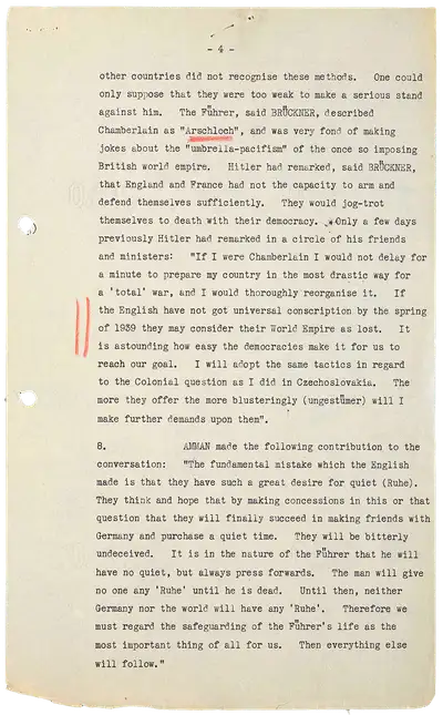 [...] other countries did not recognise these methods. One could only suppose that they were too weak to make a serious stand against him. The Führer, said BRÜCKNER, described Chamberlain as "Arschloch", and was very fond of making jokes about the "umbrella-pacifism" of the once so imposing British world empire. Hitler had remarked, said BRÜCKNER, that England and France had not the capacity to arm and defend themselves sufficiently. They would jog-trot themselves to death with their democracy. Only a few days previously Hitler had remarked in a circle of his friends and ministers: "If I were Chamberlain I would not delay for a minute to prepare my country in the most drastic way for a 'total' war, and I would thoroughly reorganise it. If the English have not got universal conscription by the spring of 1939 they may consider their World Empire as lost. It is astounding how easy the democracies make it for us to reach our goal. I will adopt the same tactics in regard to the Colonial question as I did in Czechoslovakia. The more they offer the more blusteringly (ungestümer) will I make further demands upon them".